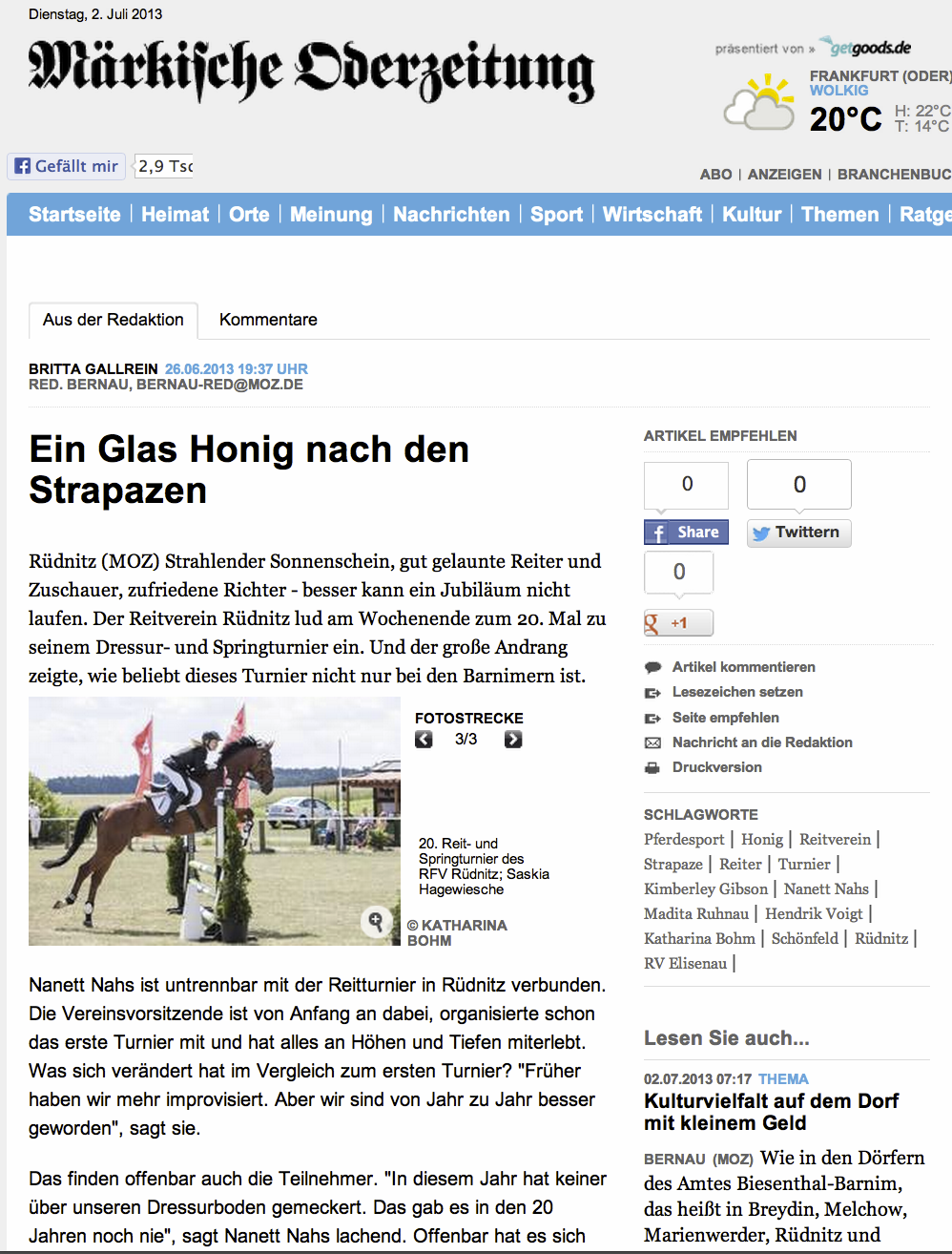 Ein Grund für die Beliebtheit des Rüdnitzer Turnier ist aber sicher die nette Atmosphäre. Für die Richter gibt es als Dankeschön ein Glas Honig aus der Region zusätzlich. Die Teilnehmer der Mannschafts-Dressur freuten sich über Sekt. „Wir wollen hier nicht den ganz großen Sport machen, aber kleine Gesten kommen gut an. Wir wollen, dass sich die Leute wohl fühlen.“ Das taten die meisten sicher. Und hoffentlich tun sie das auch im kommenden Jahr.