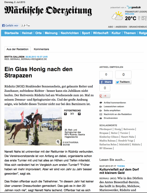 In den Springprüfungen kam es immer wieder zu Stürzen. „Woran das lag, können wir uns auch nicht erklären. Vielleicht waren unsere frisch gestrichenen Stangen den Pferden zu bunt“, mutmaßte Nanett Nahs. In der schwersten Dressurprüfung, einer Prüfung der Klasse M*, hielt Kimberley Gibson die Barnimer Fahnen hoch. Die für den RV Elisenau startende Reiterin wurde Fünfte auf Torondo van de Kruishoeve. Ihre Vereinskolleginnen Nadja und Saskia Hagewische konnten in der Dressur ebenfalls tolle Erfolge verbuchen.